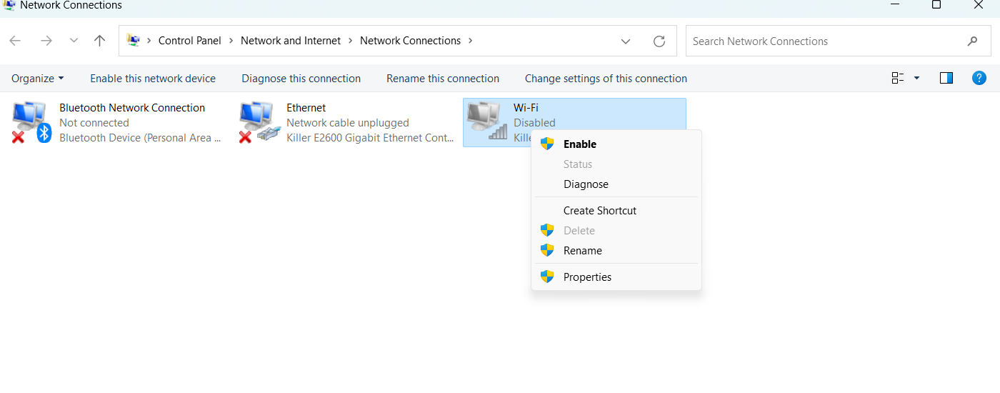 2。wi-fiを右クリック> [enable]を選択します。