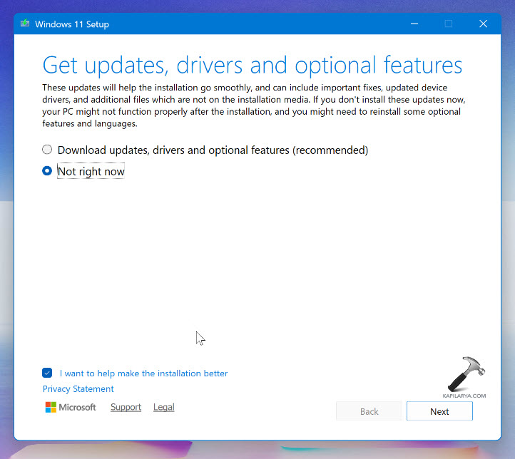 5。次の画面で、選択します今ではありません。必要に応じて、オプションを外すことができますインストールを改善するのを手伝いたいです。