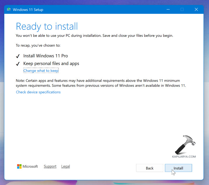 注記:このウィンドウでは、個人ファイルとアプリを保持しているかどうかを確認する必要があります。これは修理のアップグレードのみであるため、個人ファイルのアプリとデータを保持することを強くお勧めします。このように進むことにより、データは失われず、オペレーティングシステムファイルの修理のみが行われます。ただし、データも削除する場合は、[保持するものの変更をクリックしてから、[維持]を選択できます。