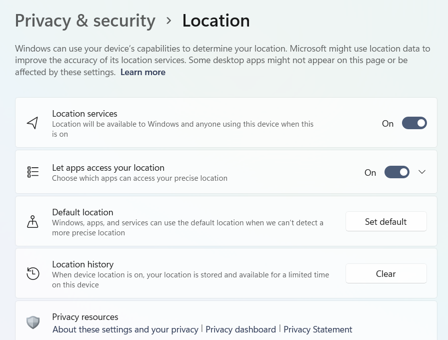 この問題は、設定で場所がオフになっている場合、またはこの機能を使用する管理者アクセスがユーザーに与えられていないときに発生する可能性があります。この問題のトラブルシューティングを試みることができる特定のオプションを以下に示します。