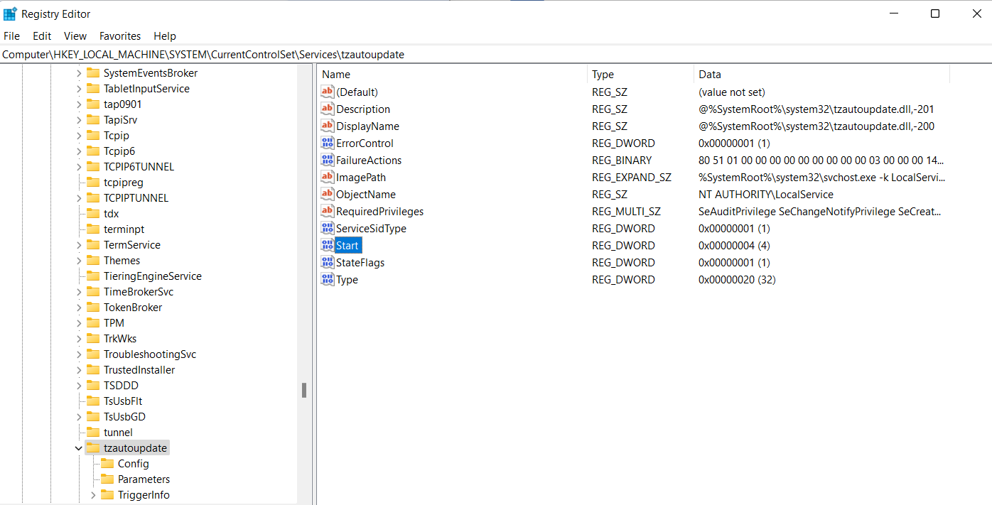 ComputerHKEY_LOCAL_MACHINESYSTEMCurrentControlSetServicestzautoupdate