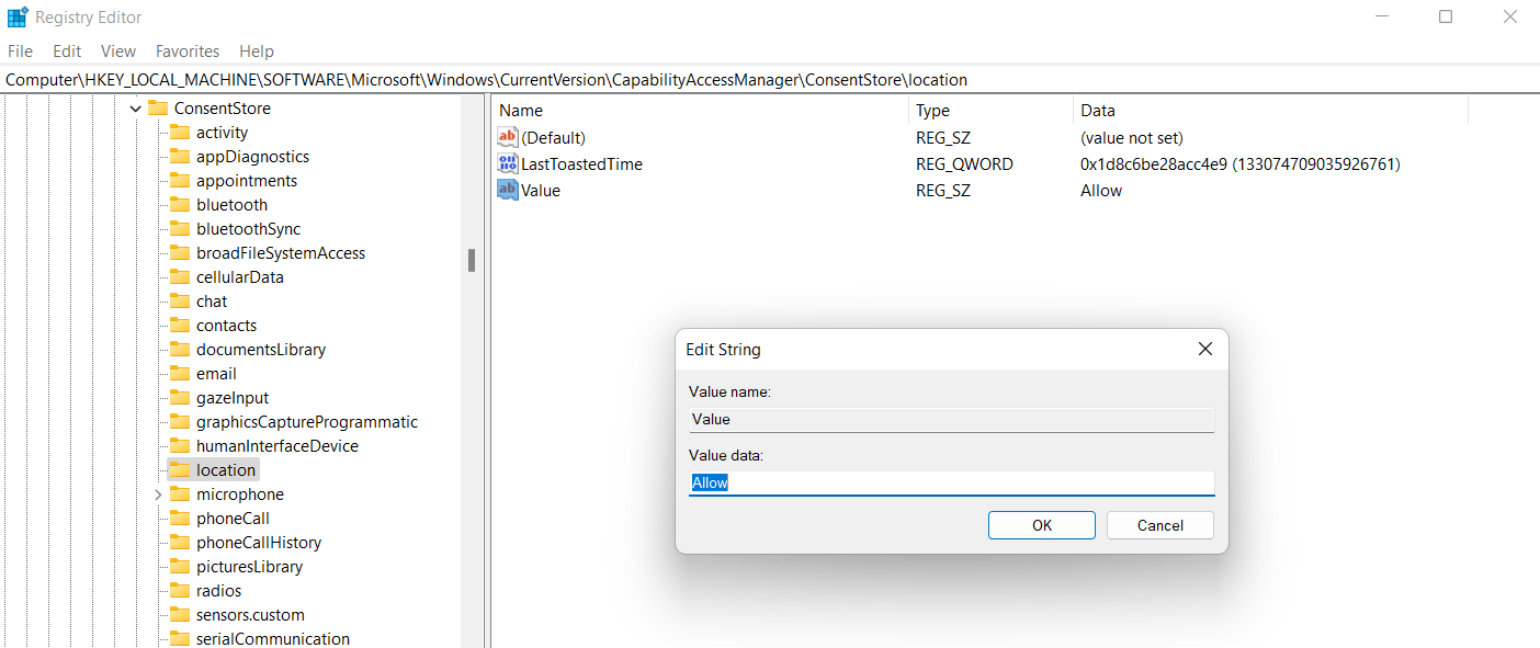 ComputerHKEY_LOCAL_MACHINESOFTWAREMicrosoftWindowsCurrentVersionCapabilityAccessManagerConsentStorelocation
