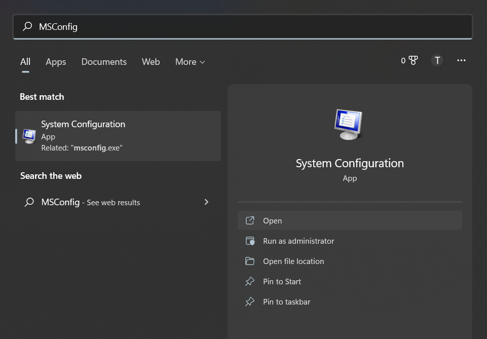 - 検索するmsconfigWindowsメニューでアプリケーションを開きます。