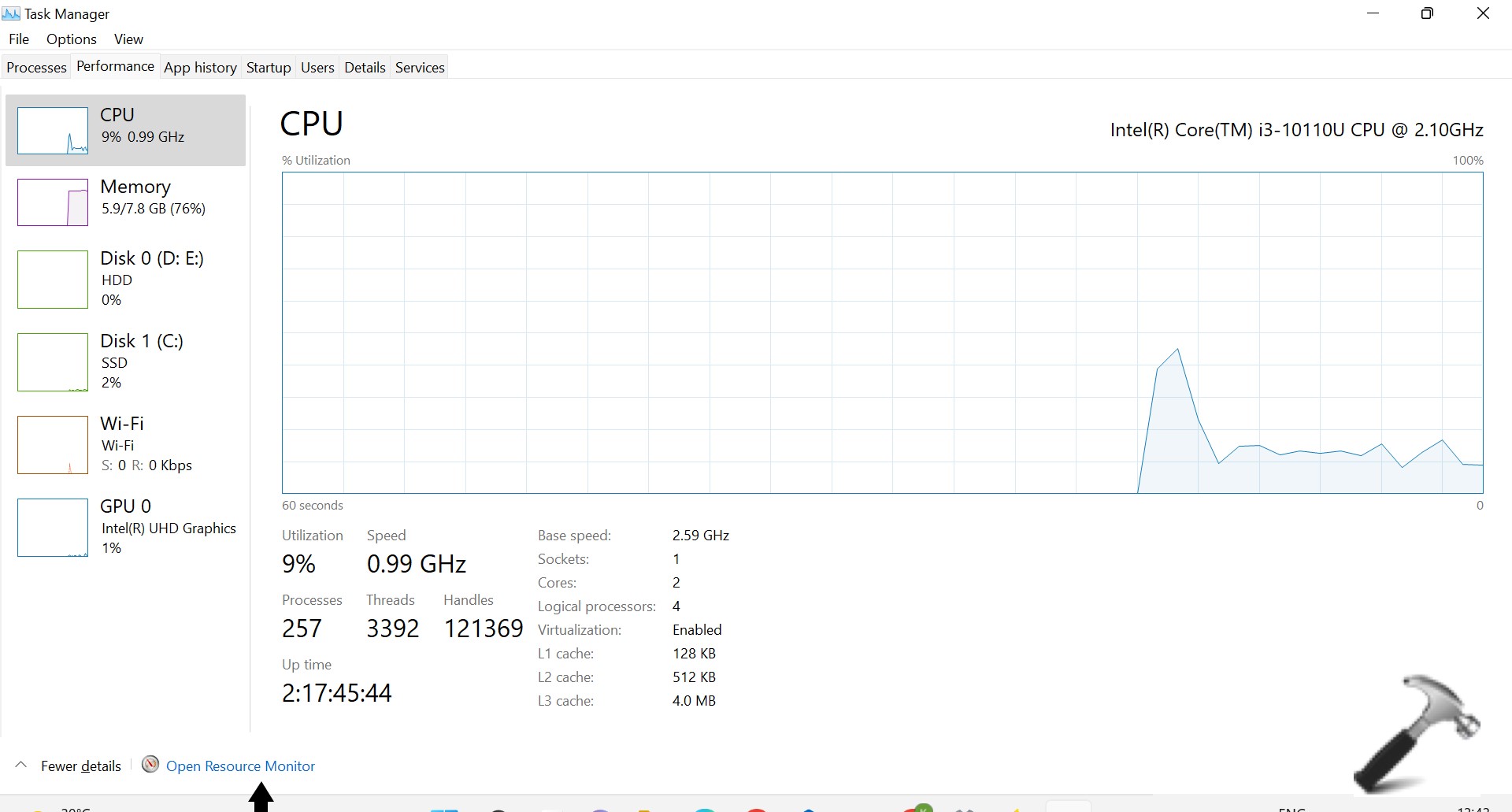 2。選択パフォーマンスタブ、クリックしてくださいオープンリソースモニター」。