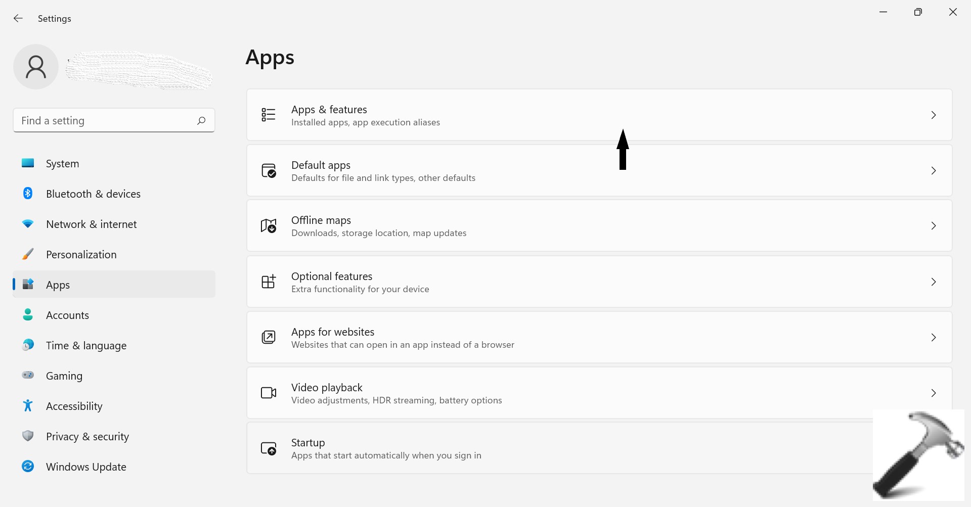 2。選択アプリ左ペインから開いていますアプリと機能。