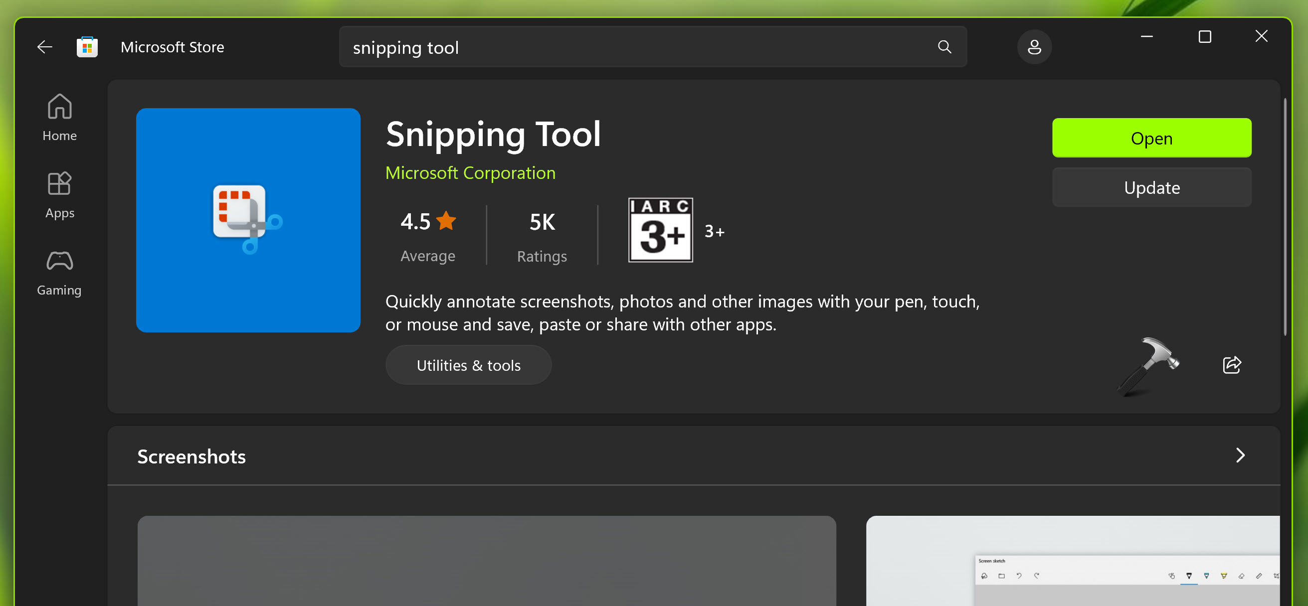 システム上のスニッピングツールが不足していることがわかったため、ストアアプリから簡単に再インストールできます。