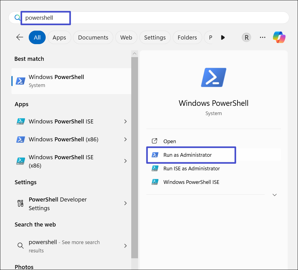 1. Windows検索バーで検索してPowerShellを開き、右クリックして「管理者として実行」として開きます。
