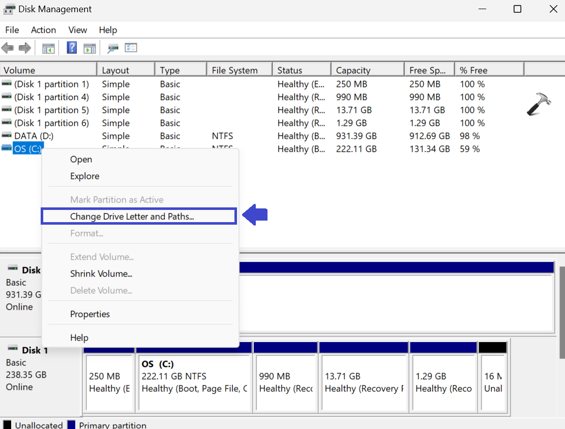 3.ここで、SSDパーティションを右クリックして、「ドライバーレターとパスの変更」を選択します。