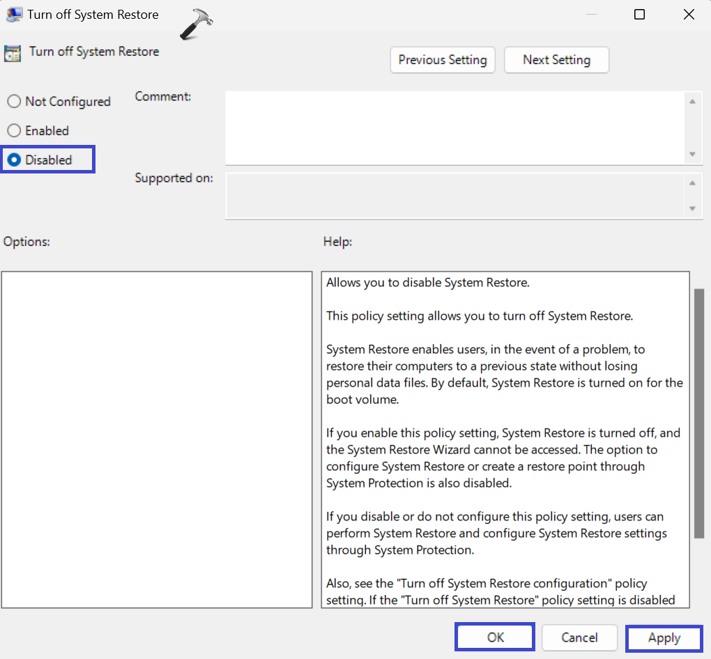 ダイアログボックスが表示されます。選択する「無効「。これを無効にすると、C:Driveのシステム復元ボタンが可能になります。