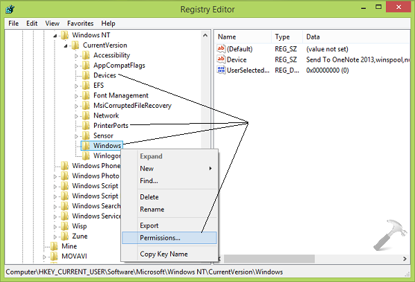 3。次に、上に表示されているウィンドウの左ペインで、3つのサブキーをCurrentVersionキーを探します。すなわちデバイス、プリンターポートそしてWindows。それらのそれぞれを個別に右クリックして選択します権限このウィンドウを取得するには: