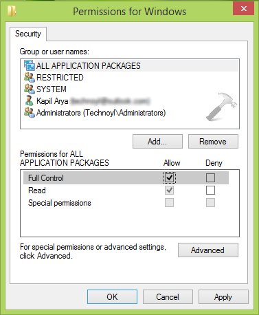 4。上記のウィンドウで、まずグループまたはユーザー名のラベルの下のユーザーアカウントを選択します。これは問題に直面しています。次に、aを提供します完全な制御チェックマークを付けることにより、許可ラベルの下許可する。これを、グループ名またはユーザー名のセクションにリストされているすべてのエントリに対して行うことができます。クリック適用するに続くわかりました。