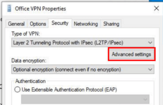 5。で安全タブ、単に選択します高度な設定のボタンVPNのタイプ:セクション。