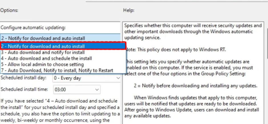 5。同じウィンドウで、選択しますダウンロードと自動インストールについて通知しますからオプション:落ちる。