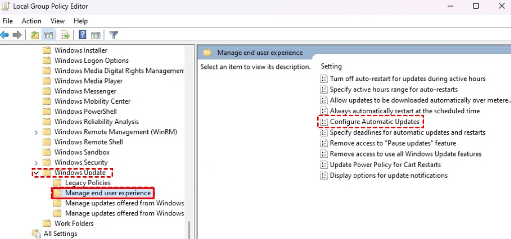 Computer Configuration > Administrative Templates > Windows Components > Windows Update > Manage End User Experience3。完了したら、ダブルクリックします自動更新を構成します右ペインのオプションを開くにはオプションを開きます。