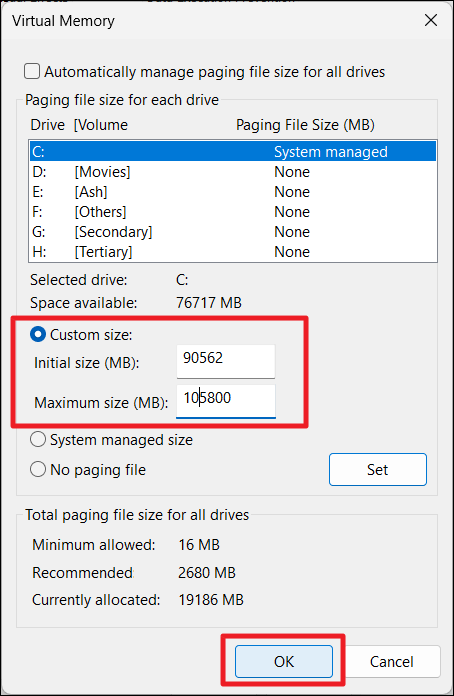 6。次に、「」を選択します。カスタムサイズ」オプションと指定初期サイズ (MB)そして最大サイズ (MB)仮想メモリ用。