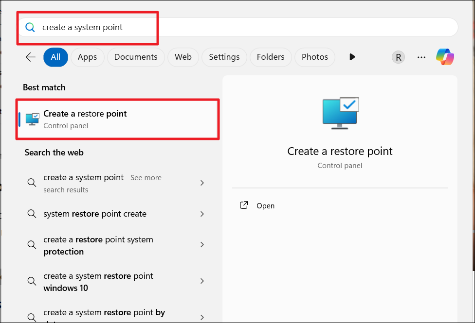 1。「」を検索します復元ポイントを作成します」とEnterを押します。