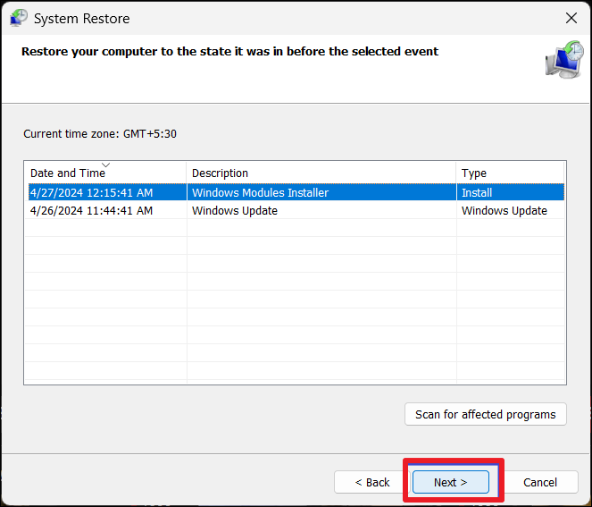 3.復元ポイントを選択して、「」をクリックします。次「。