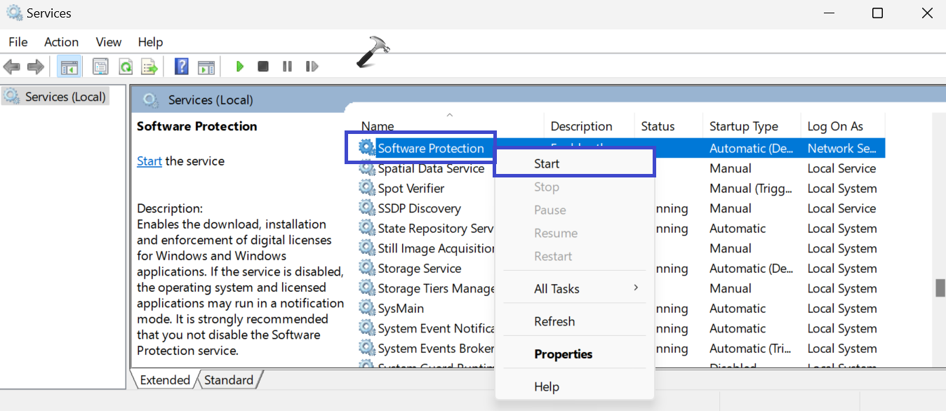 2。「」を探してくださいソフトウェア保護」オプション。それを右クリックして、「」を選択します。始める「。