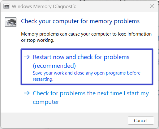 2。Windows Memory Diagnosticsツールが開いたら、「」をクリックします。今すぐ再起動して問題を確認します(推奨)" オプション。