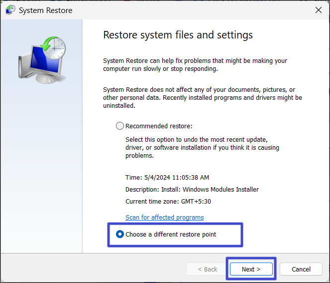 2。[システムの復元]ウィンドウで、「」を選択します。別の復元ポイントを選択します「そしてクリックして」次「。