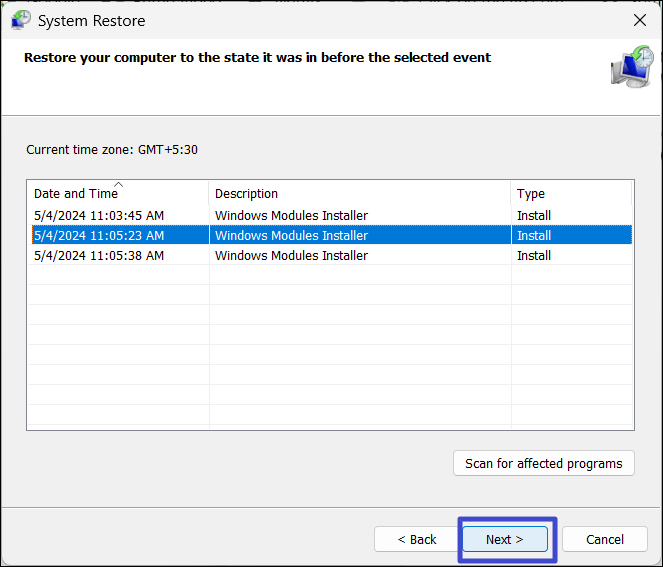 3。復元ポイントのリストから、最古のポイントを選択して、「」をクリックします。次"。