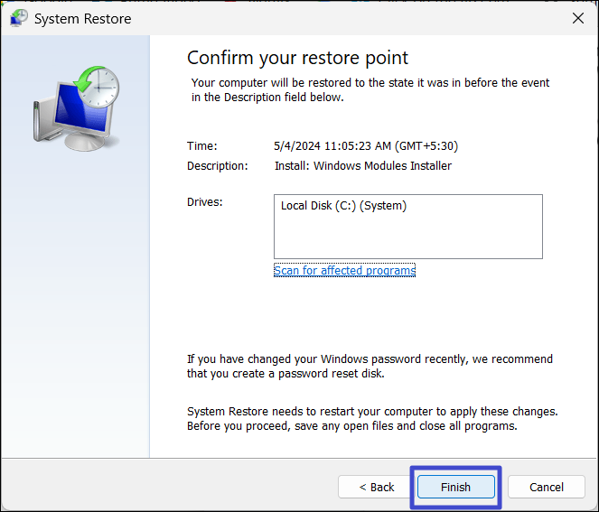 4。最後に、「」をクリックします。仕上げる」復元プロセスを開始します。