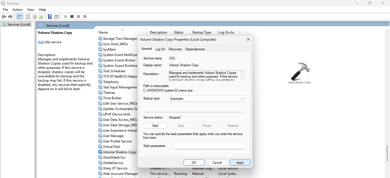 無効になったときのボリュームシャドウコピーサービスも問題を引き起こす可能性があります。したがって、サービスが有効になっていることを確認する必要があります。同じことをするための手順に従ってください。