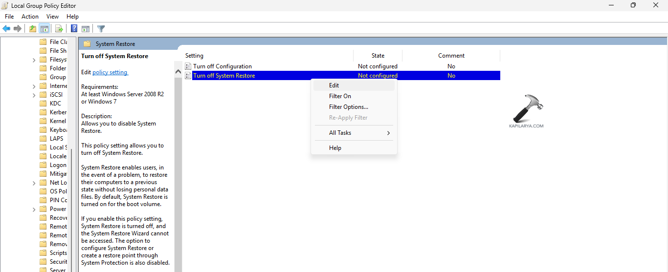 ステップ4-次に、右クリックシステムの復元をオフにし、編集を選択します。