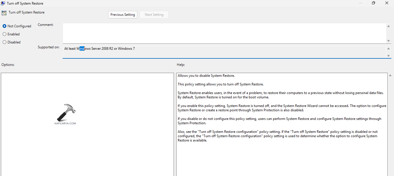間違ったシステムの復元設定は、ボリュームシャドウコピーサービスが機能しないという問題の存在のもう1つの理由かもしれません。したがって、以下の手順を使用してシステムの復元設定を構成すると、問題の解決に役立ちます
