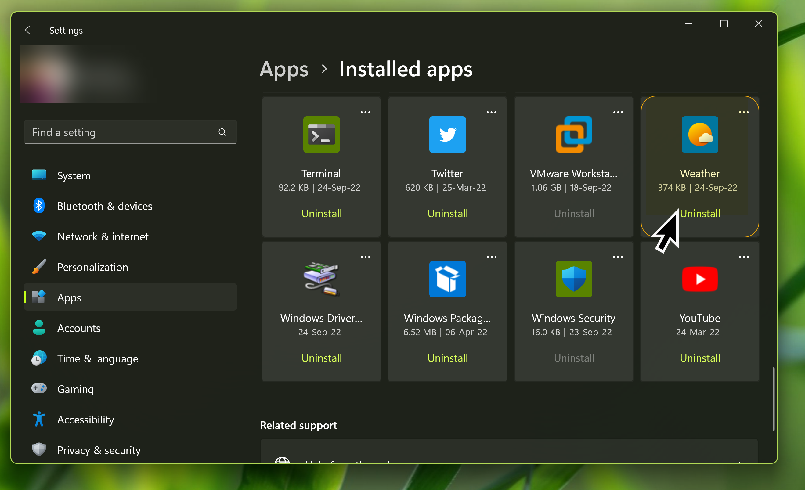 この方法では、[設定]> [アプリ]>インストールされたアプリに移動できます。 Weatherアプリのアイコンを見つけてクリックしますアンインストール。