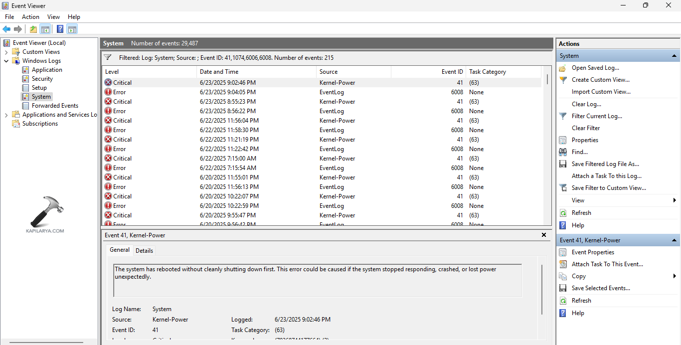 ステップ5-ここでは、イベントビューアーがシャットダウンに関連するすべてのイベントを表示します。クリティカルログまたはエラーログを選択します。 PCシャットダウンイベントに関する一般的な情報が表示されます。