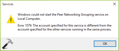 Windowsは、ローカルコンピューターでピアネットワーキンググループサービスを開始できませんでした。エラー1079:このサービスに指定されたアカウントは、同じプロセスで実行されている他のサービスに指定されたアカウントとは異なります。