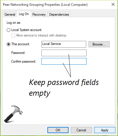2。次に、プロパティdailogボックスで、に切り替えますログオンタブ。選択しますこのアカウントオプションとタイプローカルサービスその隣の入力ボックス。パスワードを保持し、パスワードフィールドを空にします。クリック適用するそれからわかりました。