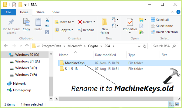 2。次に、RSAフォルダーに名前が付けられたサブフォルダーがあります機械キー。このフォルダーの名前を変更しますMachineKeys.old。