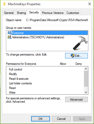 4。次に、MachineKeysのプロパティシートで、ハイライトしますみんなグループ名またはユーザー名の下でクリックします編集ボタン。
