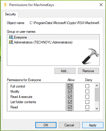 5。先に進み、MachineKeysウィンドウの権限で選択しますみんなグループ名またはユーザー名の下で、すべてのレベルに対してマークをチェックマーク許可するすべての人の許可の下での列。クリック適用するに続くわかりました。ファイルエクスプローラーを終了します。