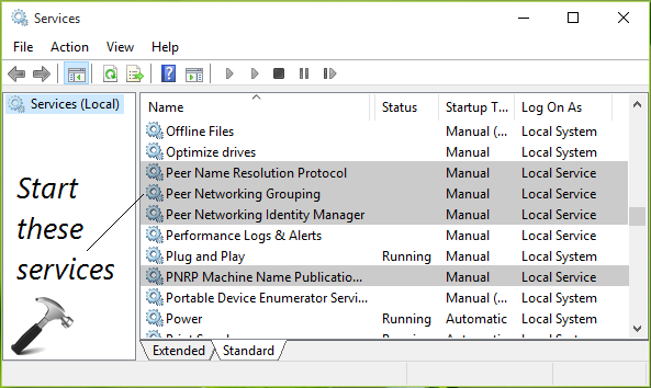 6。オープンサービスのスナップイン。名前付きのサービスを確認してくださいピアネーム解像度プロトコル、ピアネットワークIDマネージャーそしてPNRPマシン名の出版物走っています。実行されていない場合は、1つずつダブルクリックしてクリックします始める。その後、開始できますピアネットワーキンググループサービスとそれは期待どおりに機能するはずです。