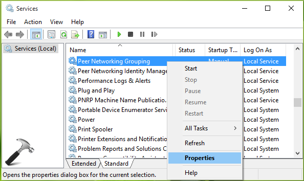 1。オープンサービスのスナップイン。右クリックピアネットワーキンググループサービスと選択プロパティ。