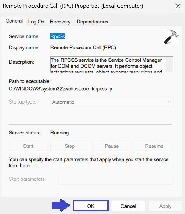 4.サービスのステータスを確認します。それが実行されている場合、それは良いです。ただし、停止した場合は、「開始」をタップしてRPCサービスを開始します。
