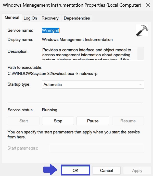 7.スタートアップタイプを自動に設定し、「開始」をタップしてWMIサービスを再開します。