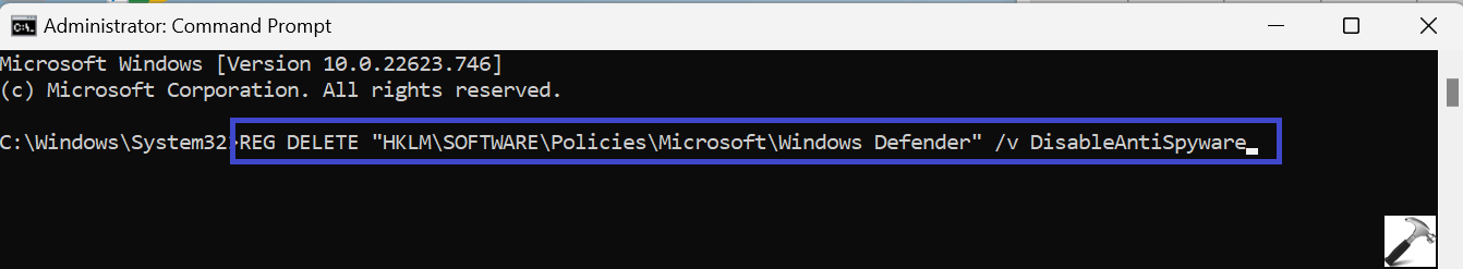 REG DELETE “HKLMSOFTWAREPoliciesMicrosoftWindows Defender” /v DisableAntiSpyware