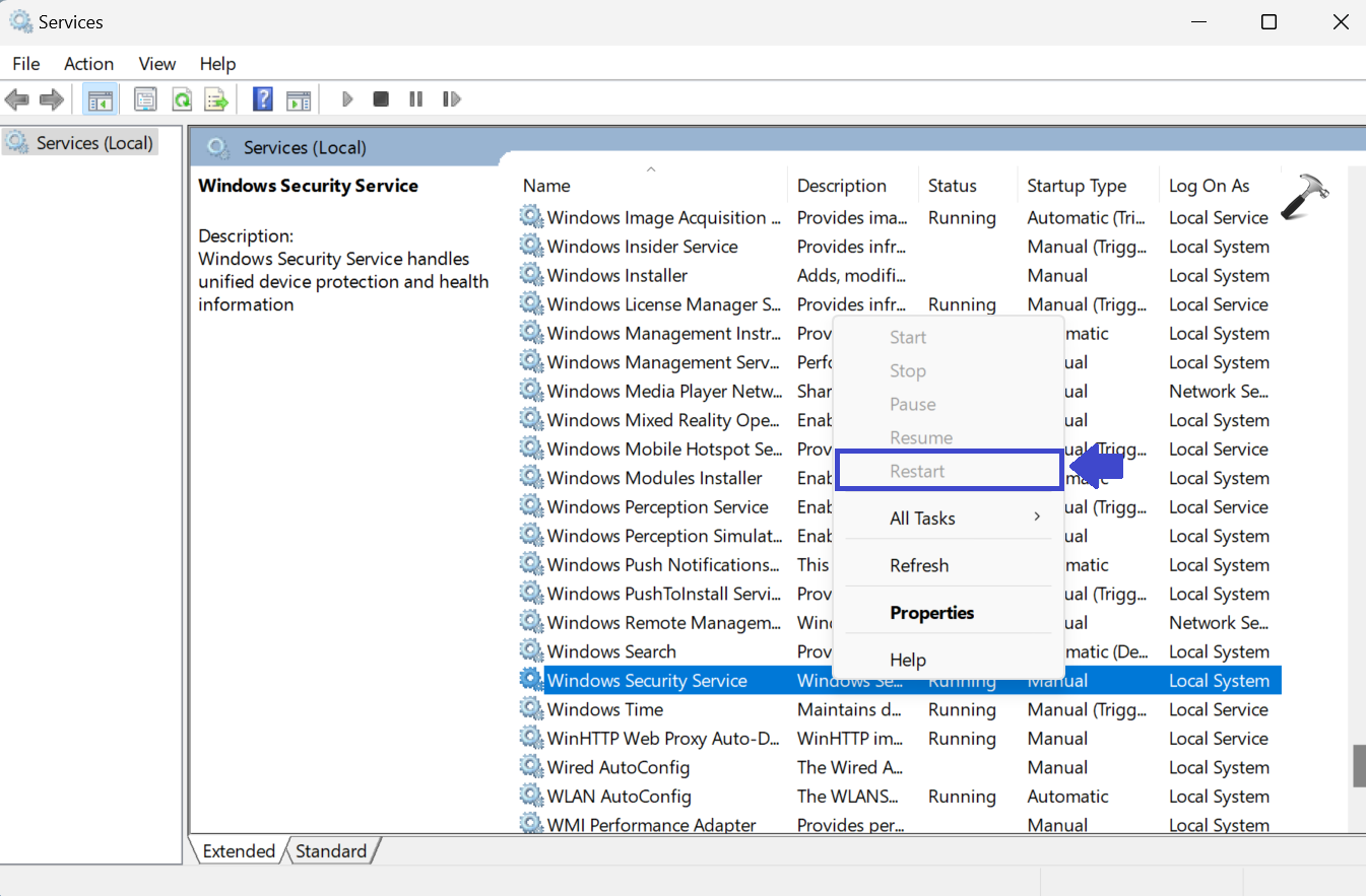 2。右ペインで、「Windows Security Service」を右クリックします。