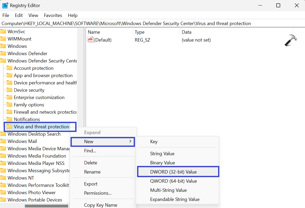レジストリキーを作成するには、「ウイルスと脅威保護」を右クリックします=> new => dWord(32ビット)値。 「uilockdown」と入力し、[OK]をクリックします。