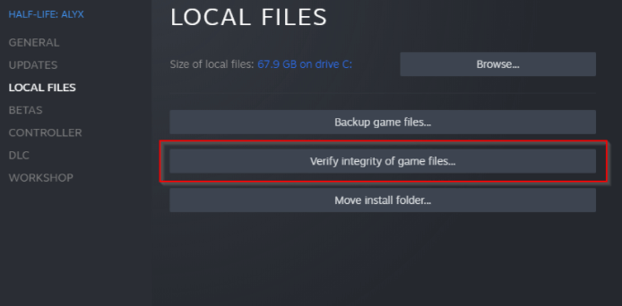 ステップ3:選択しますローカルファイル左側のメニューから選択しますゲームファイルの整合性を確認します。