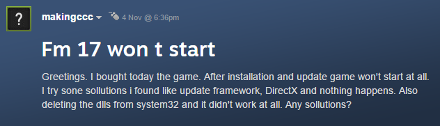 でコミュニティハブ2017年のフットボールマネージャーの中で、プレイヤーは頻繁なゲームについて不平を言っています問題。最も一般的なエラーは、クラッシュ、ゲームの開始ではなく、黒い画面です。これらの問題のほとんどは、ゲームをプレイできないものにしており、ユーザーは怒っています。