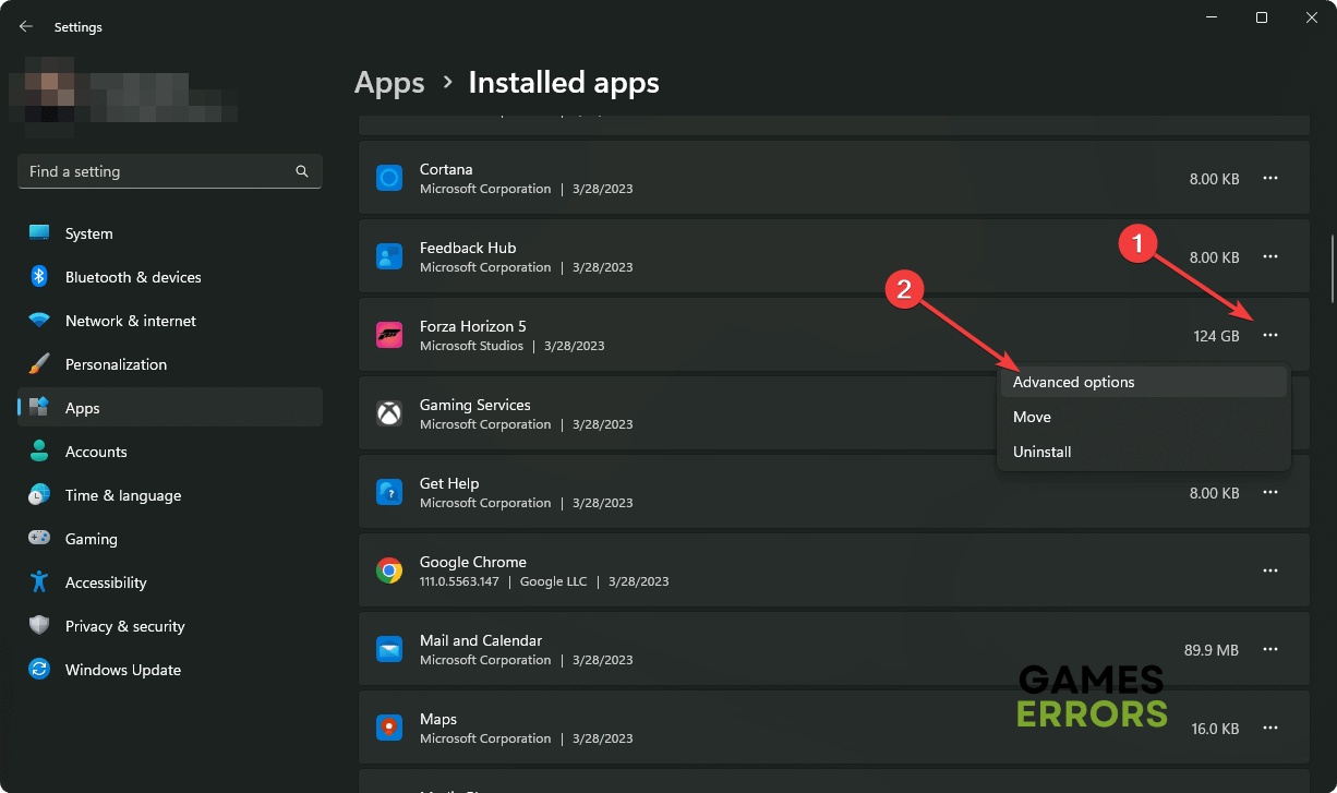 - をクリックします3つの水平ドットの隣Forza Horizon 5そして、行きます高度なオプション。