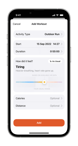 Gentler Twist:自己評価にコンテキストを提供するために、RPE(知覚された運動の速度)は、以前に記録したすべてのトレーニングタイプの通常の運動範囲をマークします。アクティビティがどのように感じられるかを評価するとき、「通常のように」ボタンをタップすると、親指がそのワークアウトタイプの平均的な運動位置に設定されます。または、ワークアウトが通常の外側にあった場合、スケールを手動で調整します