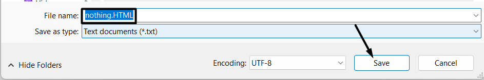 NotePadで同じことを可能にするため、WebページのHTMLコードを編集および書き込むために別のテキストエディターは必要ありません。ただし、HTMLコードを使用してテキストファイルを保存すると、テキストだけでテキストファイルを保存することとは異なります。この種のファイルを保存するときは、追加する必要があります.htmlファイルの保存時にファイル名の後。以下の画像でも同じことがわかります。