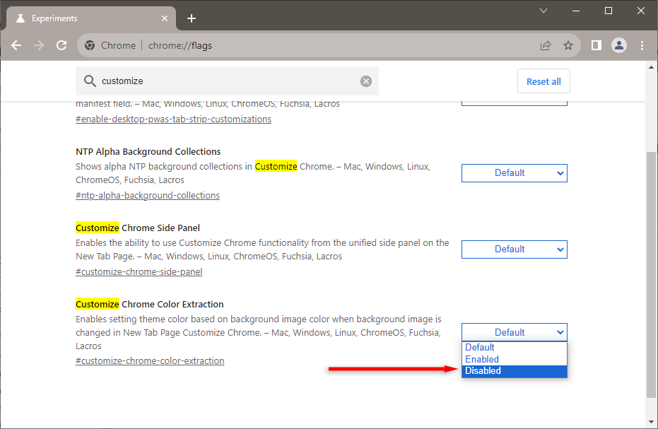 - 探すChromeカラー抽出をカスタマイズしますその値を「無効」に変更します。