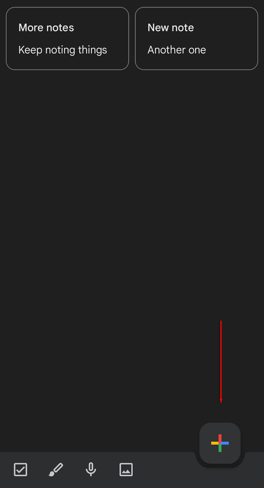 Googleは、モバイルアプリにメモを維持し、一種のフロントページに表示され、最新のノートが左上コーナーに表示されます。 「」を選択してメモを追加できます。+」右下隅にあるシンボル。画面の下部に対応するアイコンを選択することで、他の形式のメディアを追加することもできます。